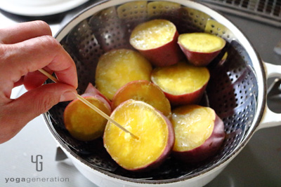 さつまいもは皮付きのまま輪切りにし蒸す。竹串がスッと通るまで火を通し、熱いうちに皮を取り除いてフォークやマッシャーなどで潰す。 -
