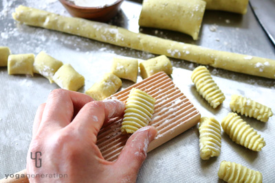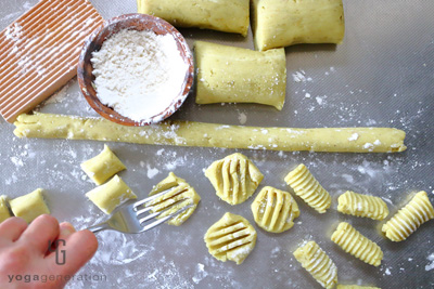 休ませた生地を適当に分割し、打ち粉(薄力粉、分量外)を作業台もしくはまな板に多めにふり、直径1cm強の紐状にして1〜1.5cmにカット、ニョッキ成形専用の板があれば溝をつけ成形する。成形した生地にも打ち粉をまぶす。 -