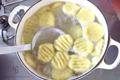 ニョッキを茹でる用の湯が沸騰したら、成形したニョッキ達を鍋に一つずつ優しく入れ、数秒したら網じゃくしなどで優しく一度上下を返し、放っておく(生地同士がくっつくのを防ぐ最初の網じゃくし返し、そのあとは生地が崩れないようにておく)。生地が浮き上がってきたら取り出し湯を切る。 -