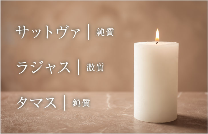物質としてのキャンドルは重たく、光を通さず、タマスの性質が現れています。しかし、火をつけると燃えるという性質が現れ、それはラジャスです。そして、燃える火の回りには光が現れます。物事を照らす光にはサットヴァの性質があります。