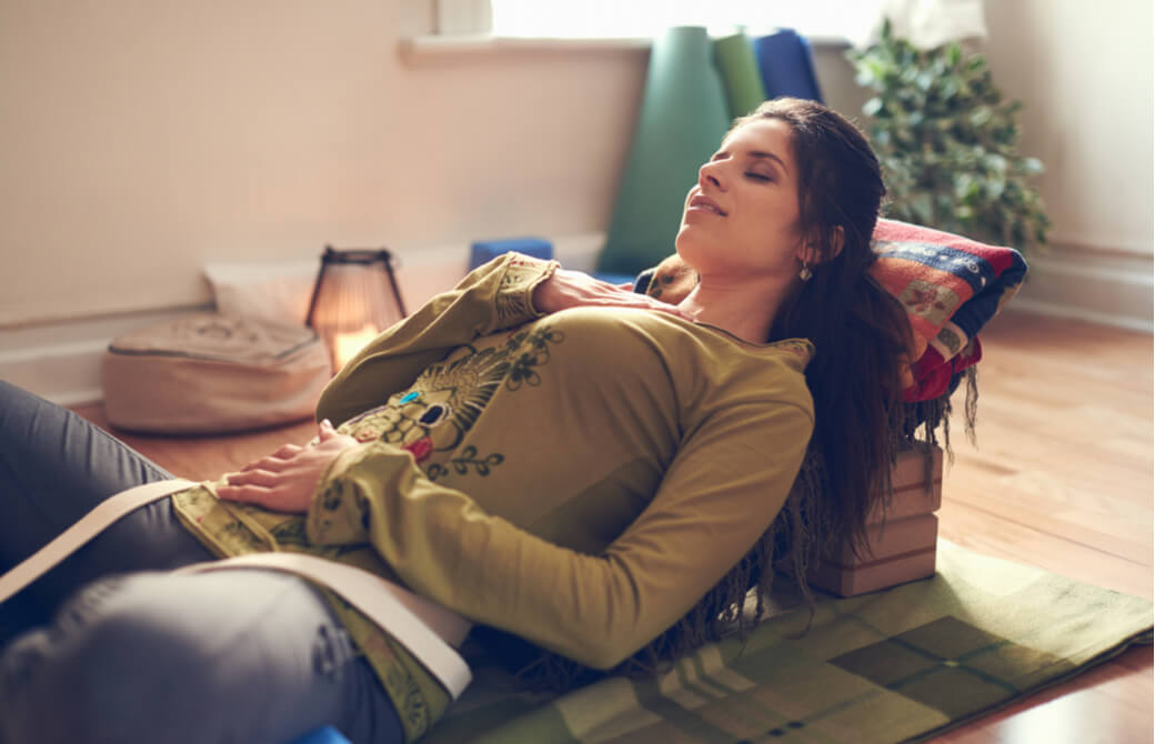 リストラティブヨガでは、ボルスター、ブロック、ストラップ、ブランケットなどのプロップスを積極的に用い、最大限に心地よい状態を作ります。この状態で深い呼吸を繰り返し、リラックスすることで不調を取り除いていきます。