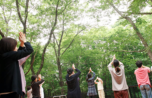 毎朝「森の朝ヨガ」を開催。どなたでも無理なく楽しめる、ヨガ・ストレッチと沢のせせらぎに耳を澄ます瞑想を組み合わせたプログラム。