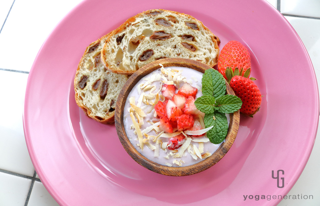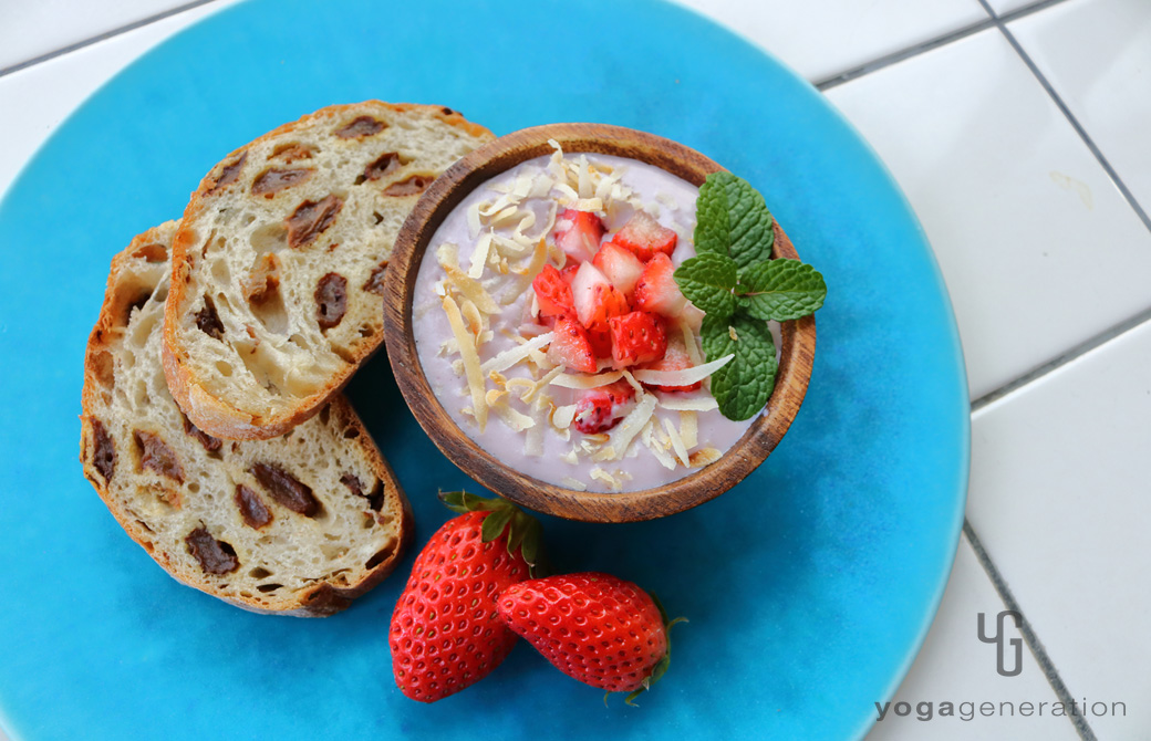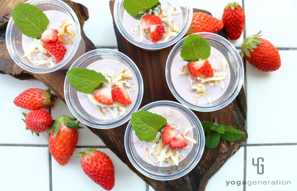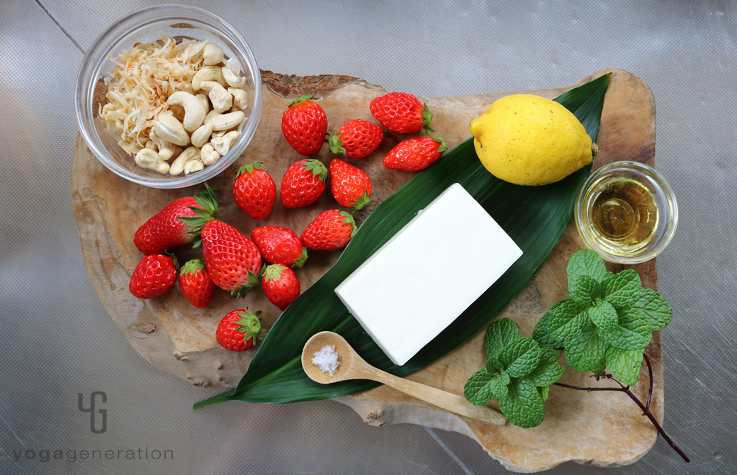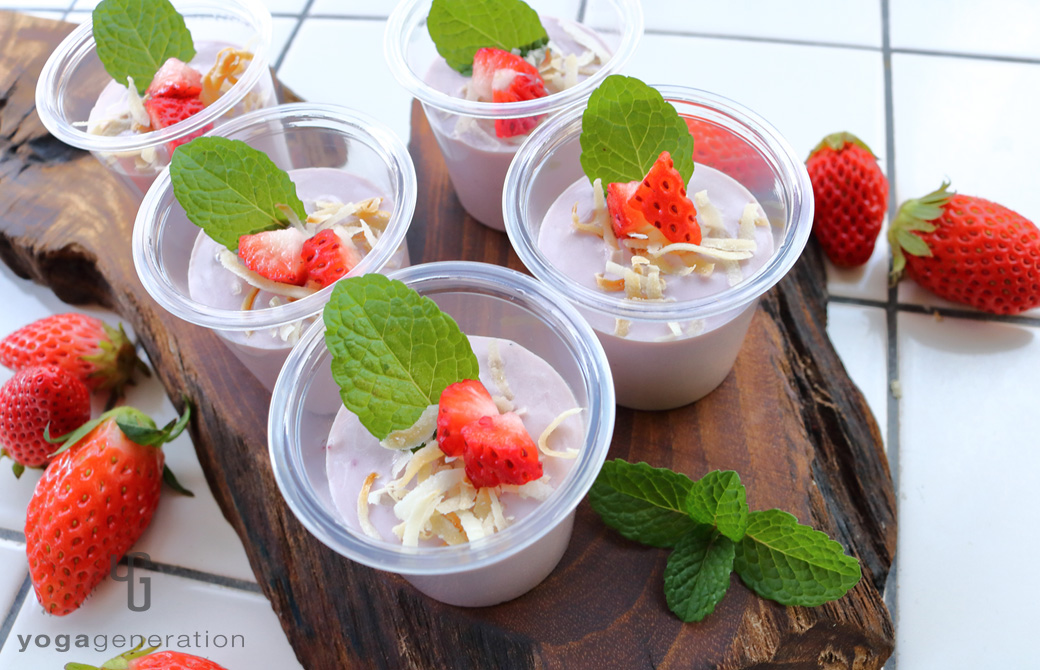 器に盛り付け、飾り用のイチゴとココナッツを添えてミントの葉を飾る。