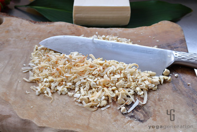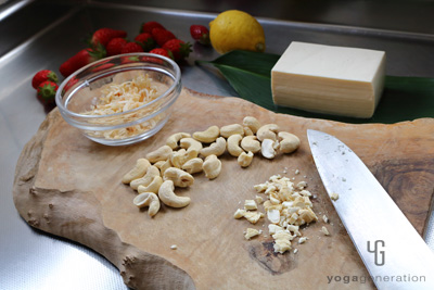 1のカシューナッツとココナッツを合わせて、包丁で刻み合わせる。 -