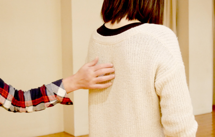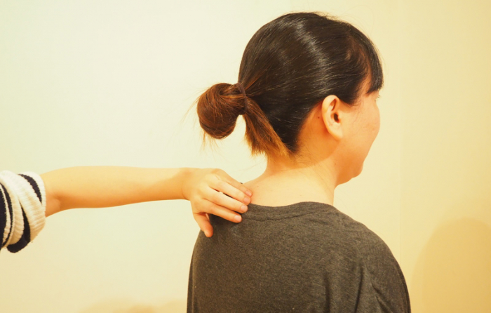 確かに背中はガチガチです。では大江先生に習った通り、骨を叩いて見ましょう。叩き方はトントンと指先で軽く叩くだけでOK。後頭部の付け根あたりから、腰のあたりまで背骨に沿って叩いていきます。