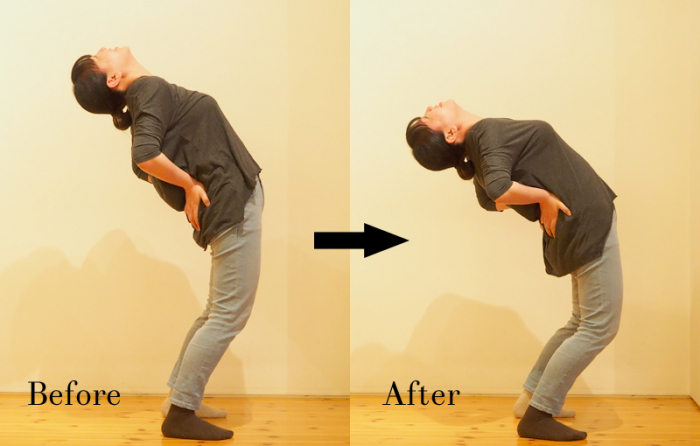 2人とも、写真で比べるとその差は一目瞭然ですね!トントンと叩かれるだけなのに、じんわり背中が軽くなるから不思議なこの裏ワザ。ヨガのポーズでも後屈のポーズはとても多いですよね。