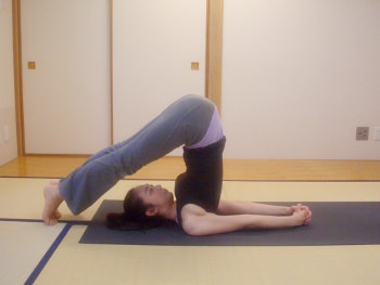 後頭部や首などの血流やエネルギーの流れを良くし、慢性的な肩、首、背中の凝りがほぐれ、内臓の働きを活発にするので、お腹や背中の贅肉もスッキリさせる効果もあるようです。ただし、このポーズは、首に負担がかかるので、首を痛めている方は行わないでください。