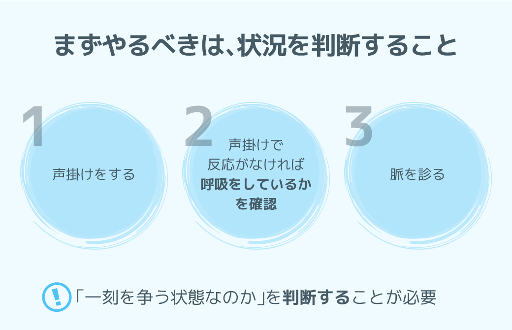 目の前で人が倒れたときに、全員が意識がなく、救命が必要という事はありません。ですので、まずやらなければいけない事は「一刻を争う状態なのかどうか」を判断することが必要になります。