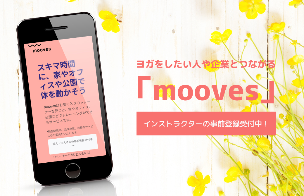 2019年夏、公開予定のサービス「mooves」は、お気に入りのインストラクターを見つけて、オフィスや家、公園などで、スキマ時間にトレーニングができるサービスです。忙しいビジネスパーソン、家事の合間に運動したい主婦の方、運動不足を解消したいご高齢の方々や企業などがお客さんとなり、様々な分野の中からインストラクターを探しマッチングしていきます。