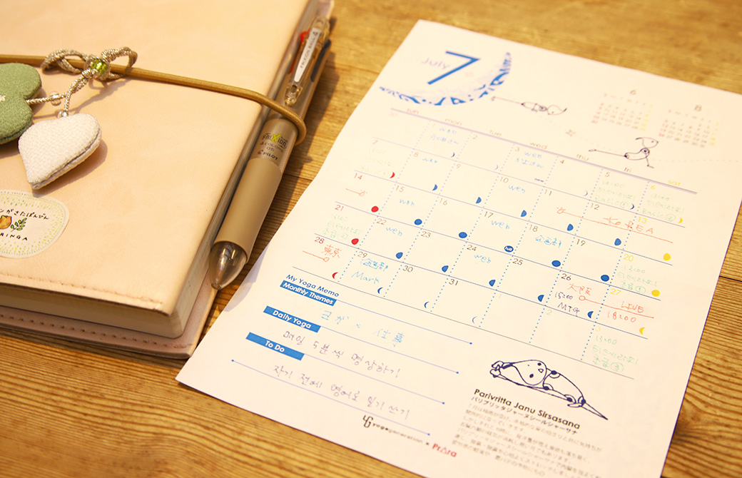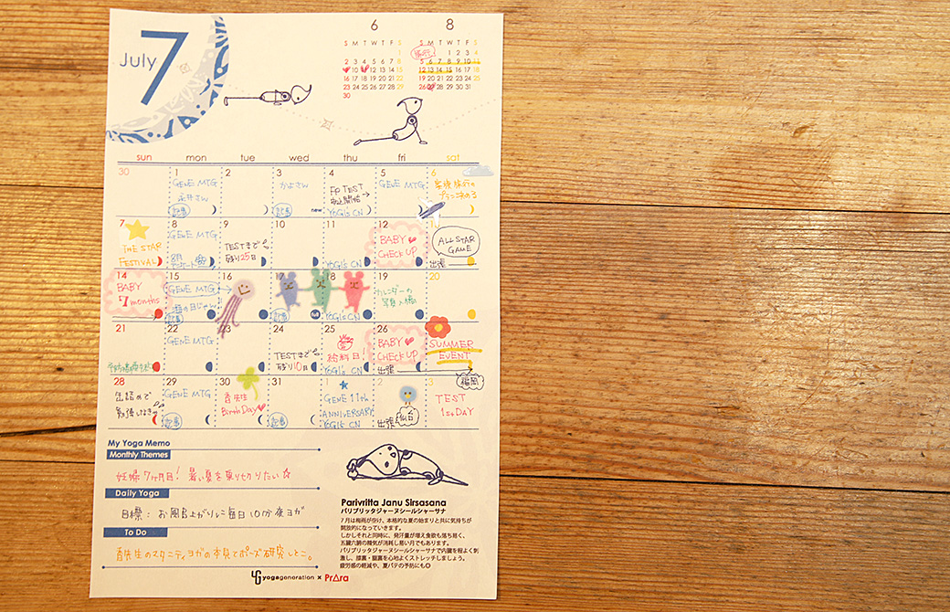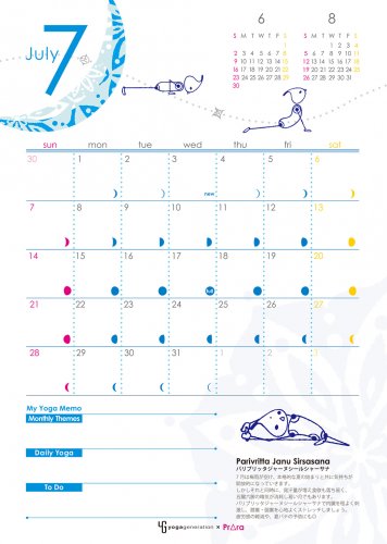 ヨガのカレンダーらしく、右下にはプラーラのアーサナの解説付き。7月は食欲や五臓六腑の関係から、パリブリッタジャーヌシールシャーサナが紹介されています。