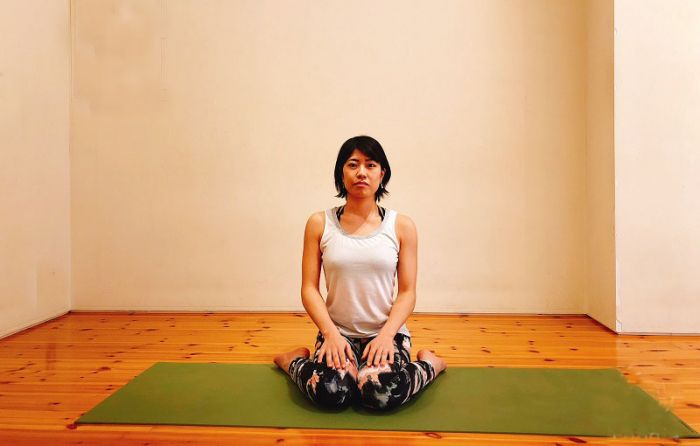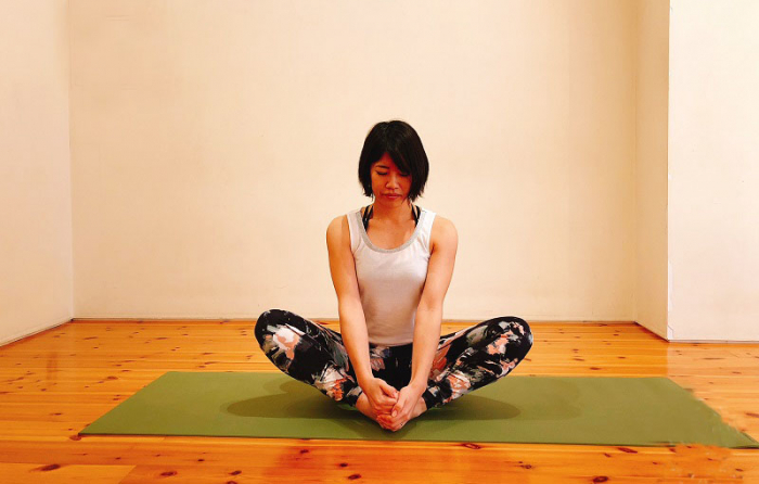 足裏を合わせて、手でつま先を持ちます。