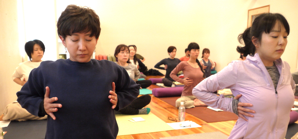 と繰り返し声をかけていました。グルジ先生自身がゆっくりと呼吸をして見せると、生徒さんの吸う息と吐く息もだんだん深まり、リラックスしていきました。