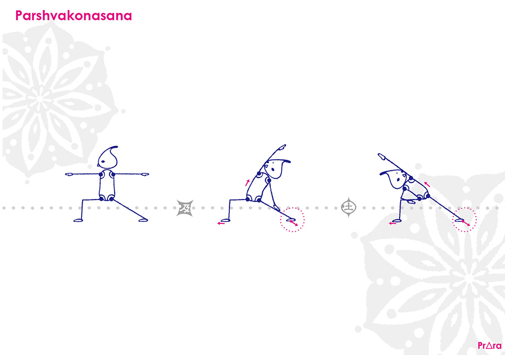 アーサナに入ると後足の裏全体で床を踏みしめるだけで充分にアーサナは安定しますが、むしろ前脚が軽くなりがちなので前膝の踏み込みを気持ち深めましょう。そして反対側へ伸びてパールシュバコナーサナへ!