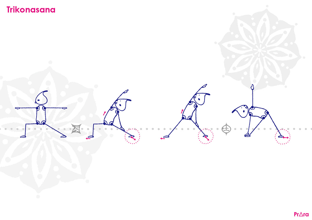 戦士のポーズ2番の脚のポジション、つまり前脚の膝は股関節から横に開き、後ろ足の足先は骨盤と同じ方向に向いている状態、これはトリコナーサナのシリーズに共通する土台です。