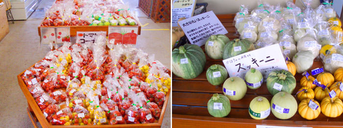 たくさんの生産者さんが『パノラマ市場』に納入しているので、シシトウ、トマト、ズッキーニ、なすと小さいものから大きいもの、そして色の異なるものまで様々あります。カラフルな野菜は心もワクワク楽しくなりますね!