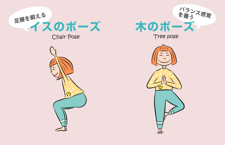 木のポーズでは身体のバランス感覚を養います。バランス感覚が良い安定した歩行や転倒予防に繋がります。