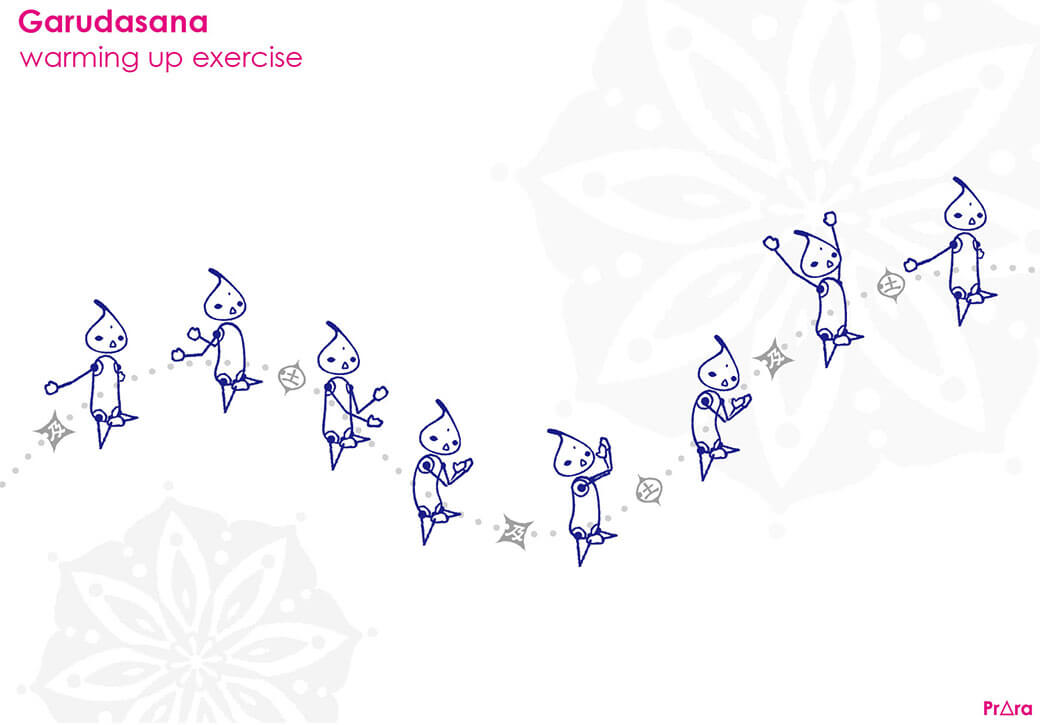 この準備運動は、背骨、肋骨や肋間筋、そして肩甲骨とその周りの筋肉を動かす事ができ、これだけでもかなりスッキリ感があります!肩周りの関節の柔軟性も高まる上に、呼吸と動きを合わせる事で集中力にもスイッチが入ります。まさにガルダアーサナの準備運動にはピッタリなんです。