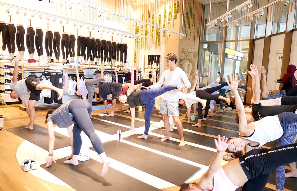 全面ガラス張りのルルレモン ルクア大阪では、道行く人がヨガをしている店内を見ながら通り過ぎていきます。店内でヨガを楽しんでいる人々を見て、ヨガをしたことがない人にもヨガを知ってもらえると良い機会ですね!