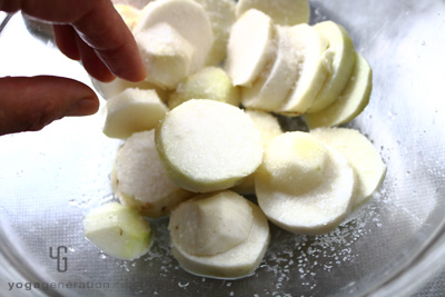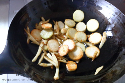 中華鍋またはフライパンに多めのオリーブオイルを注ぎ、下処理した里芋を加えて中火で温める。里芋が半透明になりこんがりした色がつき始めたらゴボウを加えて火を通す。ボウルに移し、少し粗熱をとる。 -