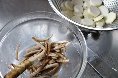 ゴボウはタワシで泥を洗い流し、ささがきにする。 -