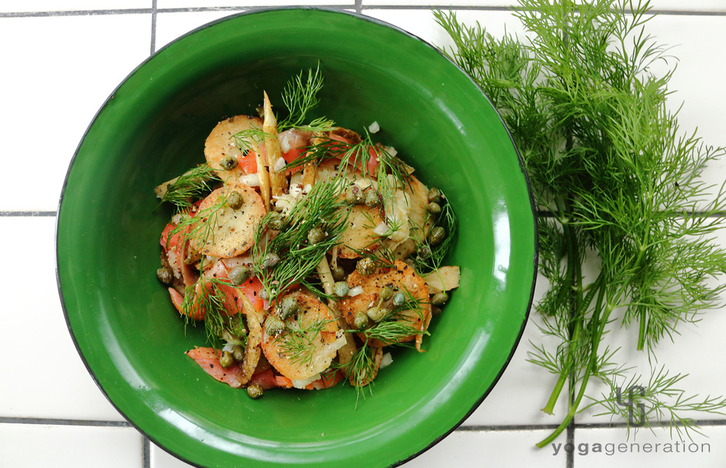 細い形状が集まった見た目が、これまた仕上がり具合に絶妙なアクセントを加えてくれる、名脇役です。ゴボウと里芋のコクに、スモークサーモンの薫香、ディルとレモンの爽やかな香りをお楽しみください。