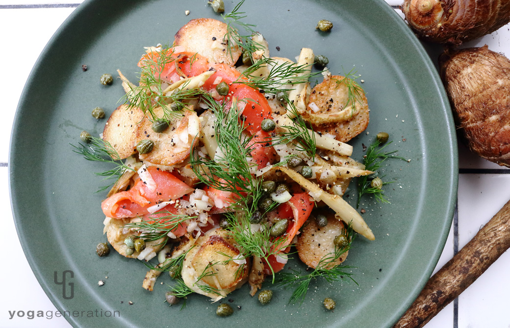 里芋のホクホクにゴボウのシャキシャキ、そしてスモークサーモンの薫香にレモンの爽やかな酸味とディルの爽やかな香り。小粒のケイパーの塩味も心地良いアクセントです。