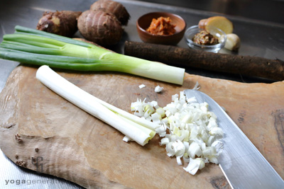 長ネギを半分にカット。白い根の方は粗いみじん切り、葉のついている方は小口切りにする。ニンニクとショウガも粗いみじん切りにする。鮭は一口大に切る。 -