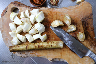 里芋は皮をむいて一口大に切る。ゴボウは洗って乱切りにする。 -