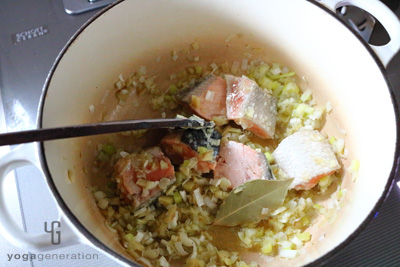 厚手の鍋にみじん切りにした長ネギ、ニンニク、ショウガとオリーブオイルを加えて弱火で熱する。良い香りがしてきたら少し火力を強くし、鮭とローリエを加え、鮭の表面の色が変わるまで焼き固める(中まで火が入らなくてOK!)。 -