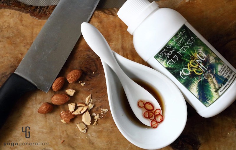 このサラダはお皿との色合わせが楽しいのも特徴です。パクチーの緑色、アーモンドの黄色と茶色、唐辛子の赤色が美しいバランスです。私自身、深く学んでいるチャクラワークの観点も併せてお皿との色合わせもご紹介させて頂きます。