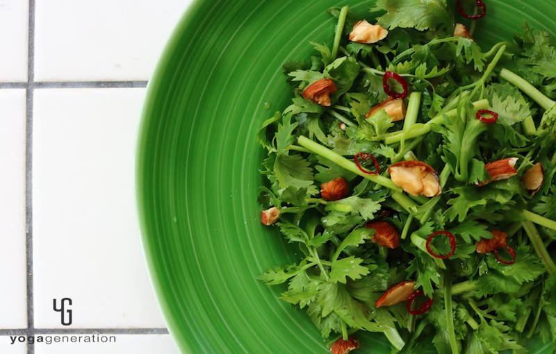 - 器にパクチーをこんもり盛り、砕いたアーモンドを散らす。食べる直前に1を回しかける。