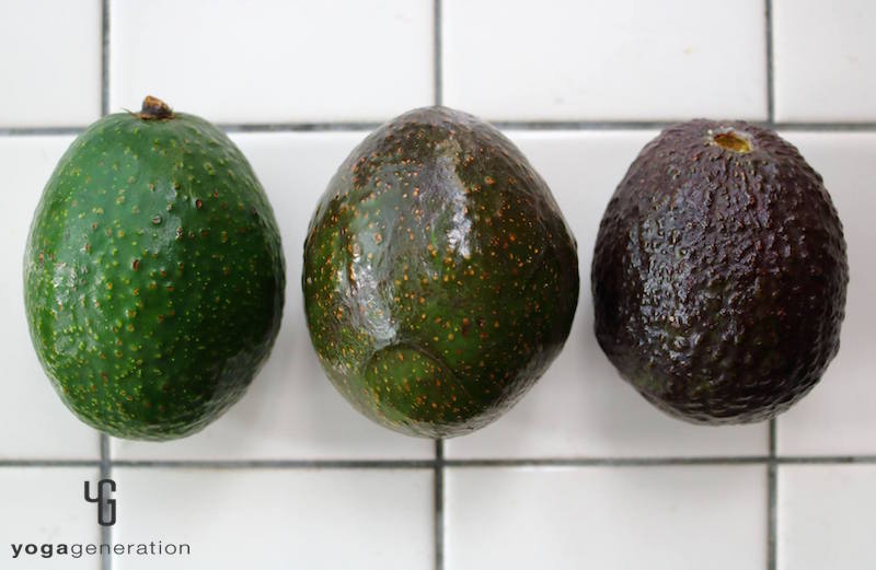 この3段階のアボカド、左から右にかけて完熟度合いが変化しています。購入してすぐに食べたい場合は一番右のような力強い黒紫色のものを選んでください。
