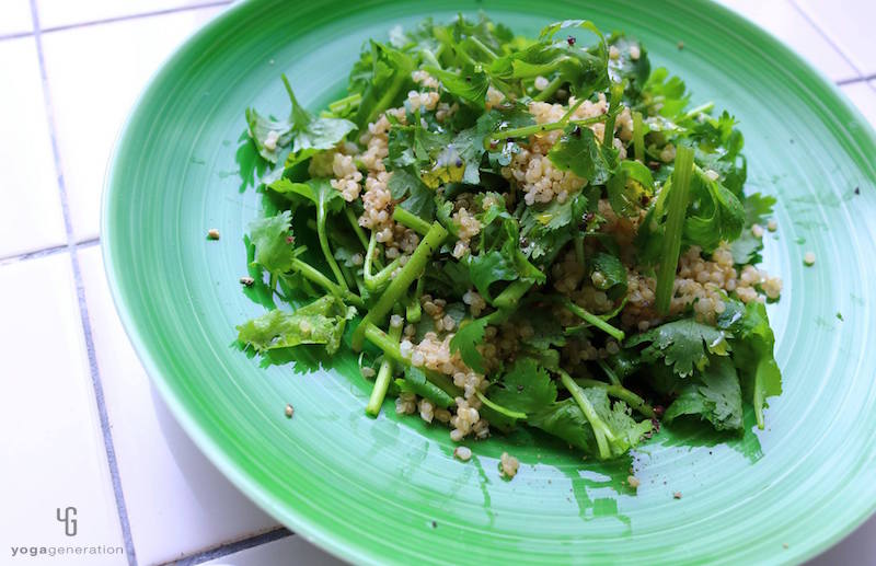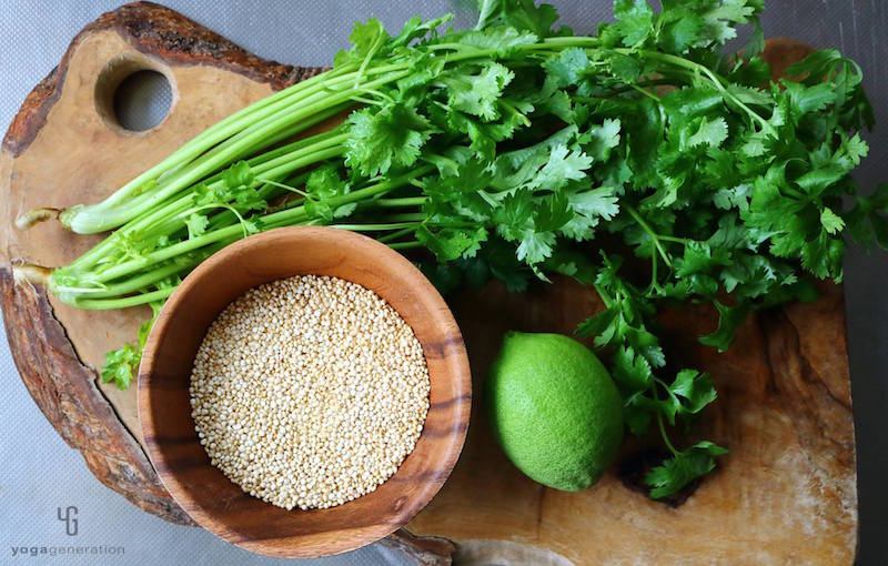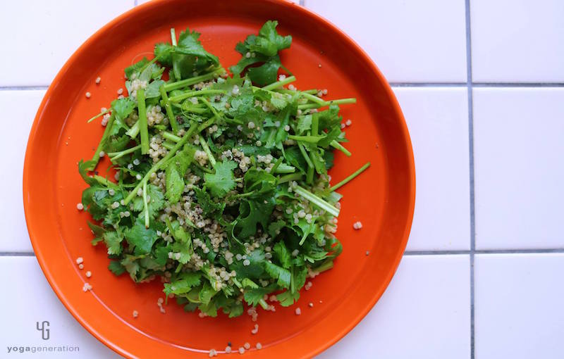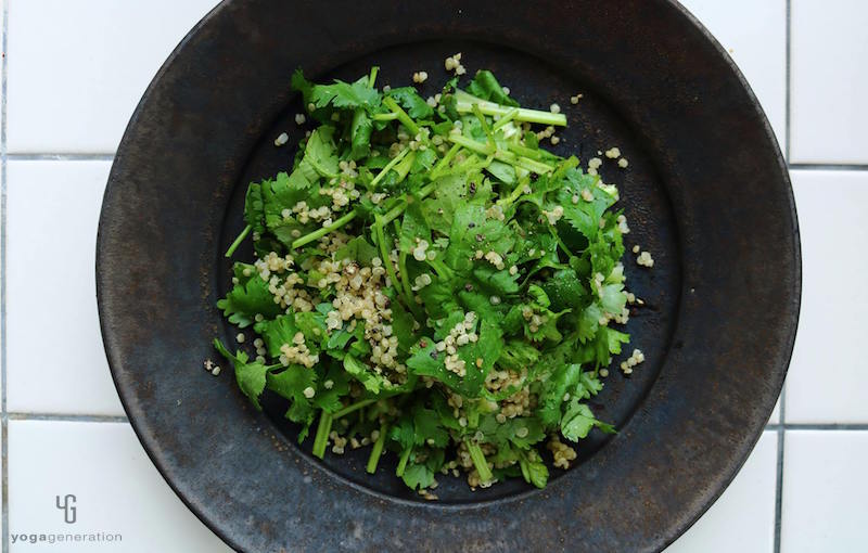 キヌアは細かいザルでさっと洗う。厚手の鍋に入れて、キヌアの倍量の水を加えて蓋をし弱火で20分ほど火にかける。20分後に全体を素早く混ぜ合わせ、すぐに蓋をして10分ほど蒸す。火が通ったら広げて冷ます。 -