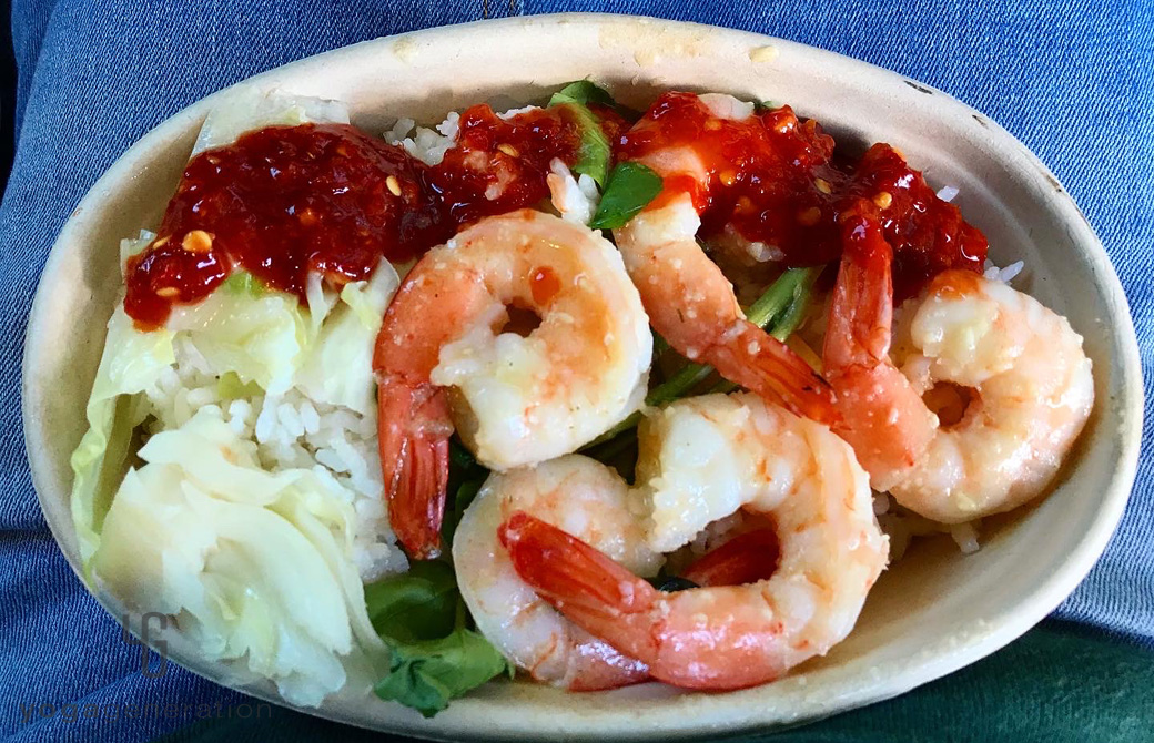 でもハワイならではの地元大人気のガーリック・シュリンプ丼を口にしたり。