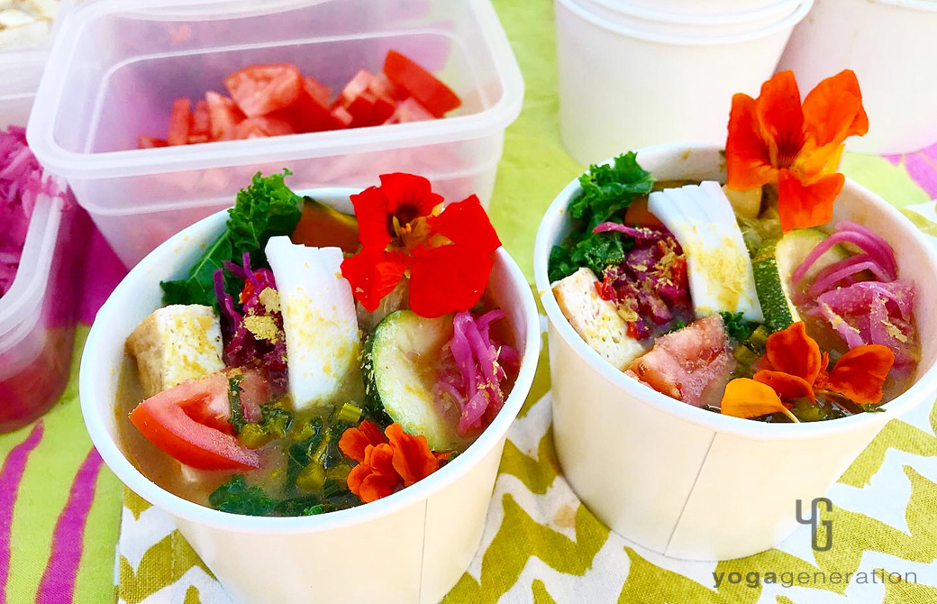 健康志向の方に大人気なのが、こちらの『ヴィーガン・ラーメン』。食せるお花をあしらってカラフルな上、麺は一般的な小麦粉の麺とグルテンフリーな春雨の麺から選べます。