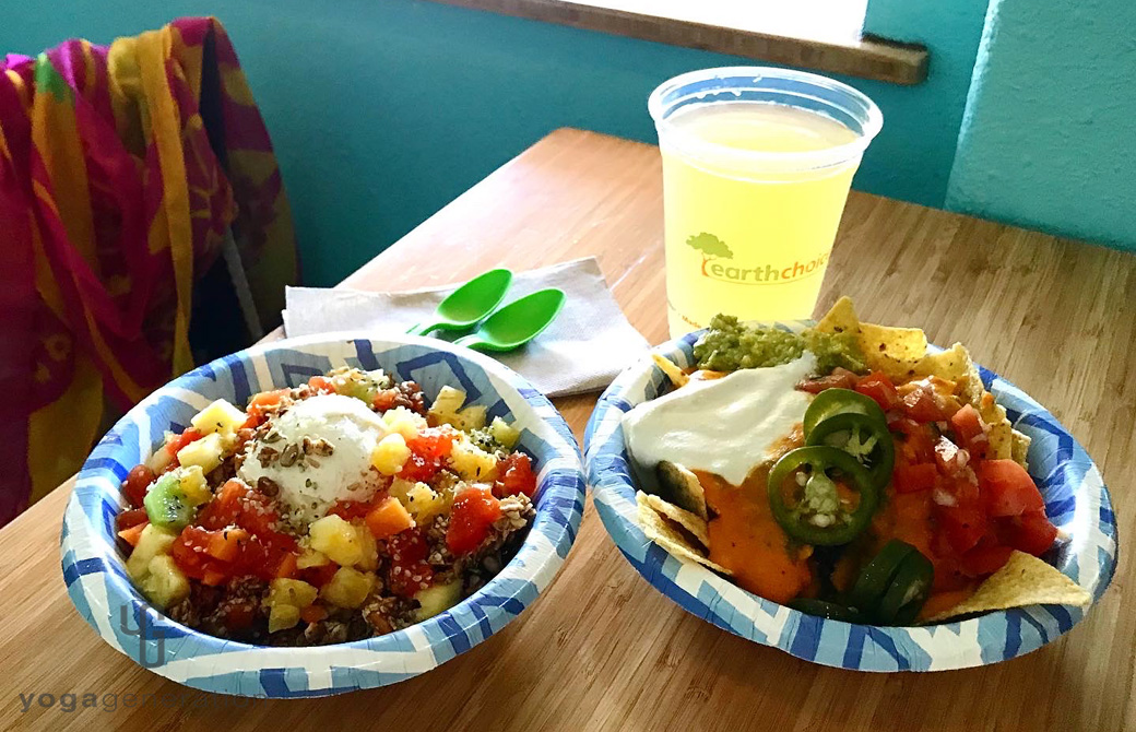 ここは現地在住の方から一押しのお店。コンブチャはもちろん、植物性素材のみを使用したサイドディッシュも豊富。ヴィーガンなナチョス(トウモロコシチップスと濃厚なクリームソースの前菜)と、アサイーのボウルを頂きました。