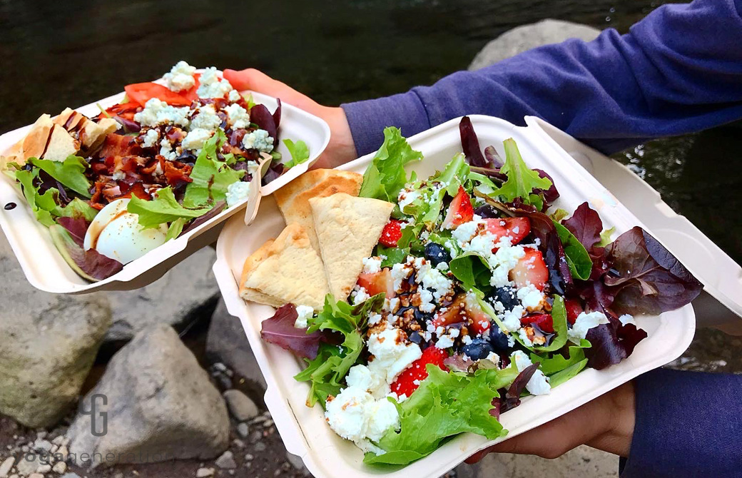 手前はイチゴとクランベリー、フェタチーズのサラダ。奥はゴルゴンゾーラチーズトッピングのコブサラダ。テイクアウトして渓流脇に腰掛けながら頂きました。