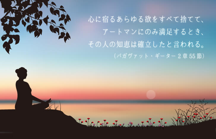 心に宿るあらゆる欲をすべて捨てて、アートマンにのみ満足するとき、その人の知恵は確立したと言われる。(バガヴァット・ギーター2章55節)