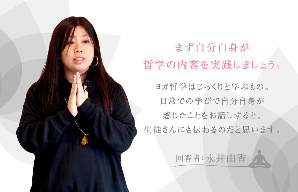 とても当たり前のことしかお答えできなくて恐縮ですが、ヨガ哲学はじっくりと学ぶものですので、日常での少しずつの学びが自分自身を変えて、結果、生徒さんにも伝わるのだと思います。