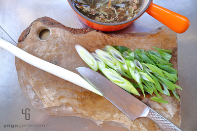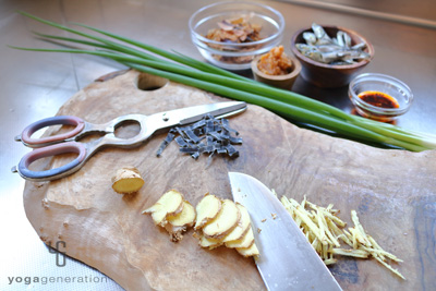 昆布はハサミで細く切る。ショウガは千切り、細ねぎは小口切り、パクチーは2〜3cm幅くらいのざく切りにする。 -