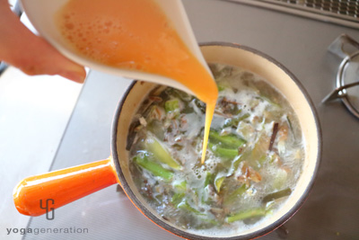 4の鍋の火を少し強める。フツフツ沸騰している場所を中心に、溶き卵を細く長く回しいれ、残りの菜の花(火が通りやすい部分)を加える。そのまま5秒ほどしたらすぐに鍋に蓋をし火を止める。 -