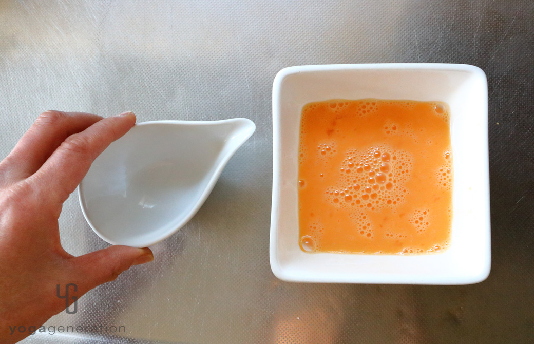 - 溶き卵を作るとき、出来れば『まあるい』器よりも、どこかに角がある器にすると鍋に注ぎやすくなります。もちろんまあるい器でも、溶き卵を落とし入れる際に箸などを伝せるように入れるのもオススメです。