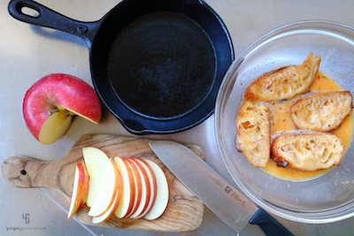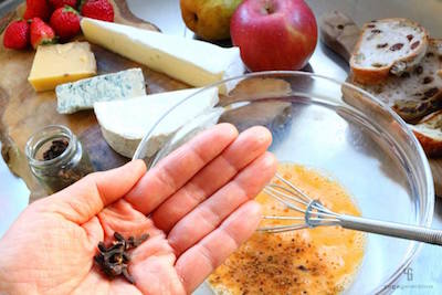 卵液を作る。ボウルに卵を割り入れて泡立て器などでよくほぐし、牛乳または豆乳、お好みのスパイスを加えてさらに混ぜ合わせる。甘めの味わいにしたい場合はここで糖分を加える。フルーツは火が通りやすいように薄くスライスする。 -