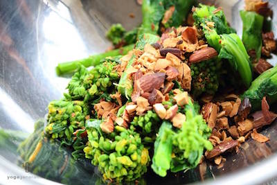 下ごしらえした菜の花と2.のアーモンド、材料2を和え、好みの味わいに調える。仕上げにお好みで粒黒胡椒を砕いて散らす。