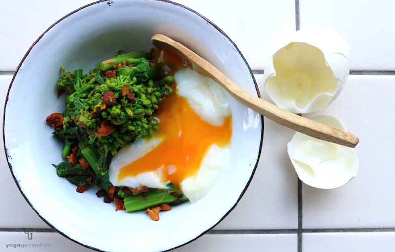温泉たまごと絡めて食べる幸せ…。白い器と菜の花の緑、温泉たまごの白&黄。そこにちょこっとプラスされるローストアーモンドの茶色。このバランスがたまらなく愛おしい。