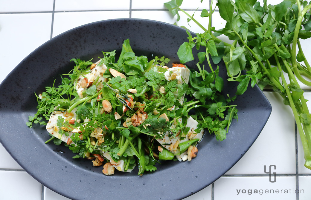 器に絹ごし豆腐を手で割りながら盛り付け、ざく切りハーブたちとローストして砕いたナッツたちをたっぷり添える。