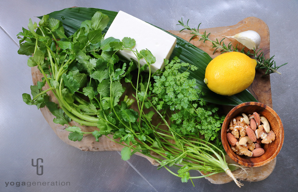 絹ごし豆腐の滑らかな舌触りに、山盛りのフレッシュハーブたちを添えて楽しみましょう。そしてドレッシングにもハーブを効かせて。ガーリックのパンチ力とレモンの爽やかさをプラスして、お皿を抱えてたっぷり頂きたい味わいです。