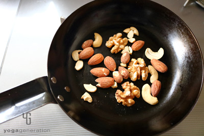 ナッツ類はフライパンで軽く炒って湿気を飛ばし、香ばしくしておく(もしくはトースターで火を入れる)。冷めたら適当な大きさに粗く砕いておく。 -