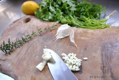 ニンニクを粗いみじん切りにする。ローズマリーは茎から葉を外し、それ以外のフレッシュハーブ類はざく切りにしておく。 -