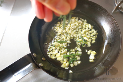 フライパンにエキストラヴァージンオリーブオイルと粗みじん切りにしたニンニク、粗塩を入れて弱火で加熱する。ニンニクの周りに細かい泡が出来始め良い香りがしてきたら、ローズマリーの葉を加える。ローズマリーの香りがしてきたらすぐに火を止める。 -